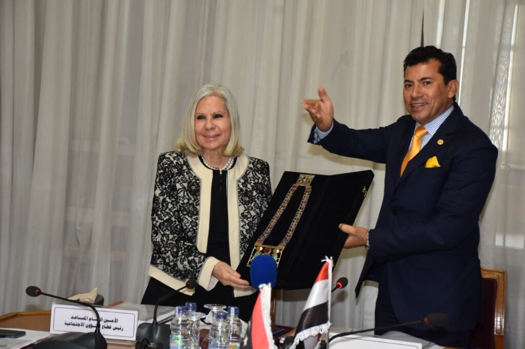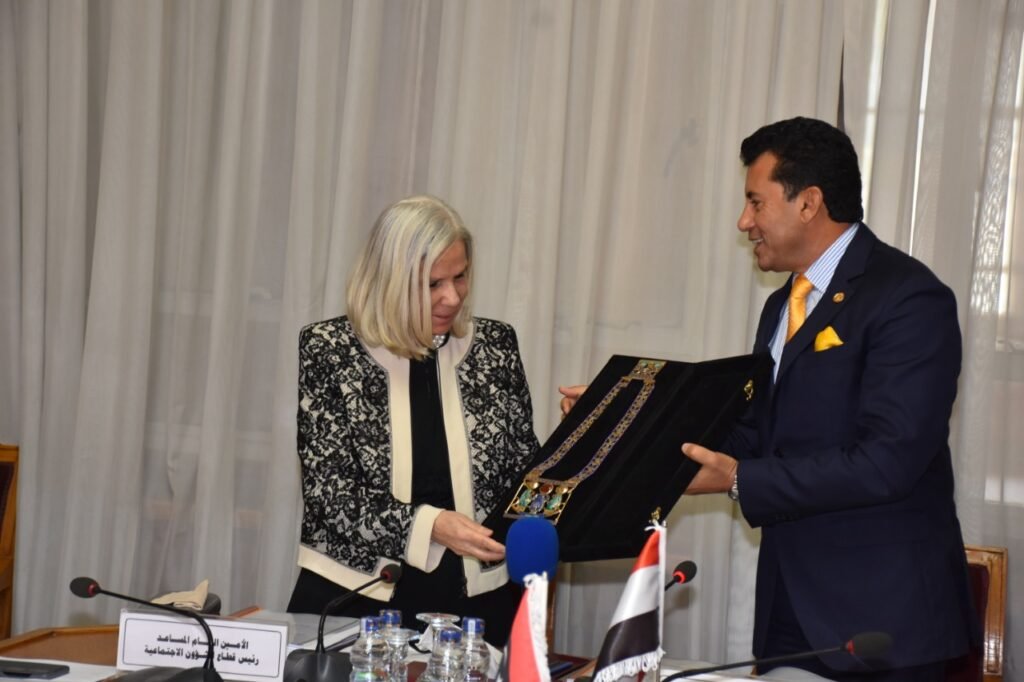 وقام الدكتور أشرف صبحى، وزير الشباب والرياضة، رئيس المكتب التنفيذى بتسليم السفيرة قلادة المكتب التنفيذى تقدريا لدورها فى دعم العمل الشبابى العربى.