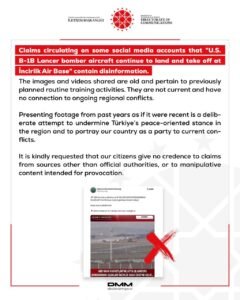 أصدر مركز مكافحة التضليل الإعلامي التابع لإدارة الاتصال برئاسة الجمهورية التركية بيانًا رسميًا، نفى فيه صحة الادعاءات المتداولة عبر بعض حسابات مواقع التواصل الاجتماعي بشأن استمرار هبوط وإقلاع طائرات القاذفات الأمريكية من طراز B-1B لانسر في قاعدة إنجرليك الجوية.