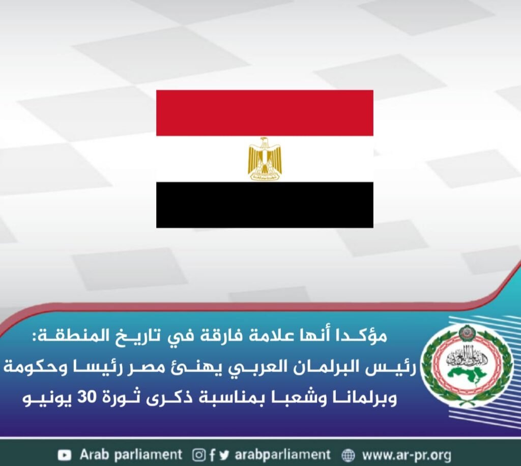 مؤكدا أنها علامة فارقة في تاريخ المنطقة: رئيس البرلمان العربي يهنئ مصر رئيسا وحكومة وبرلمانا وشعبا بمناسبة ذكرى ثورة 30 يونيو