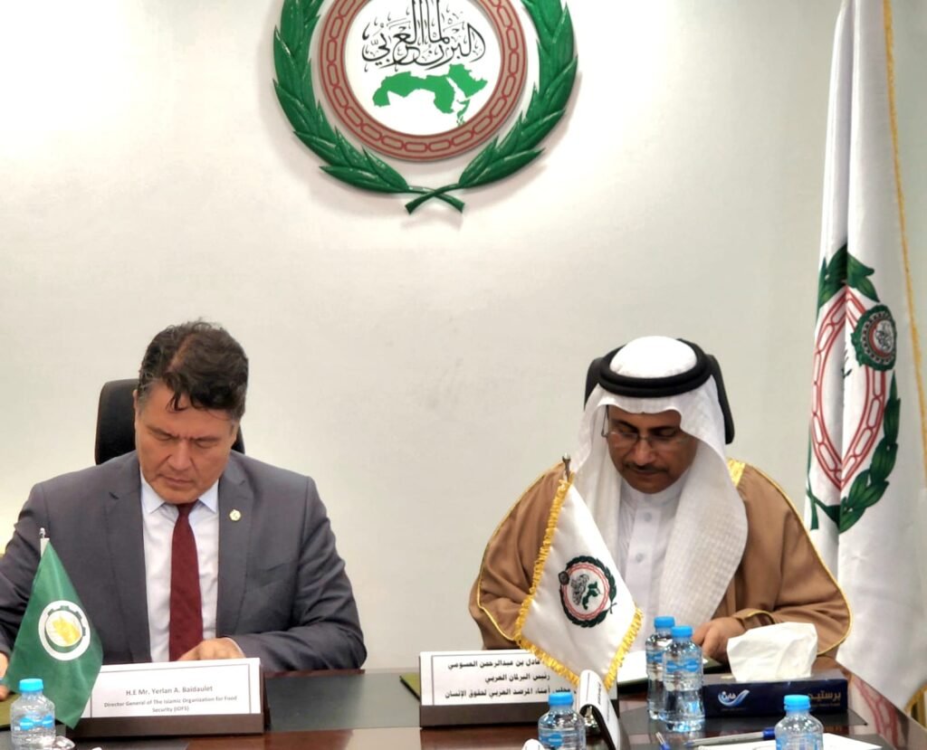 استكمالاً لاهتمام المرصد العربي لحقوق الإنسان بقضية الأمن الغذائي وفي إطار بناء علاقات الشراكة المؤسسية وتعزيز القدرات في الدول العربية بالتنمية الزراعية والأمن الغذائي باعتبارها أحد التحديات التي تواجه عالمنا العربي بل والعالم أجمع، وقع المرصد العربي لحقوق الإنسان ويمثله معالي السيد عادل بن عبد الرحمن العسومي، رئيس البرلمان العربي، رئيس مجلس أمناء المرصد العربي لحقوق الإنسان؛ مذكرة تفاهم مع المنظمة الإسلامية للأمن الغذائي التابعة لمنظمة المؤتمر الإسلامي، ويمثلها معالي السيد يرلان بيدوليت المدير العام للمنظمة، لتعزيز أدوات التعاون المشترك في الدول العربية، وخاصة أن المنظمة لديها برامج متنوعة في كل من مصر، والبحرين، والسعودية، والإمارات، والمغرب، وجيبوتي، والسودان، وهي تتوسع في أنشطتها لتشمل كافة الدول العربية.