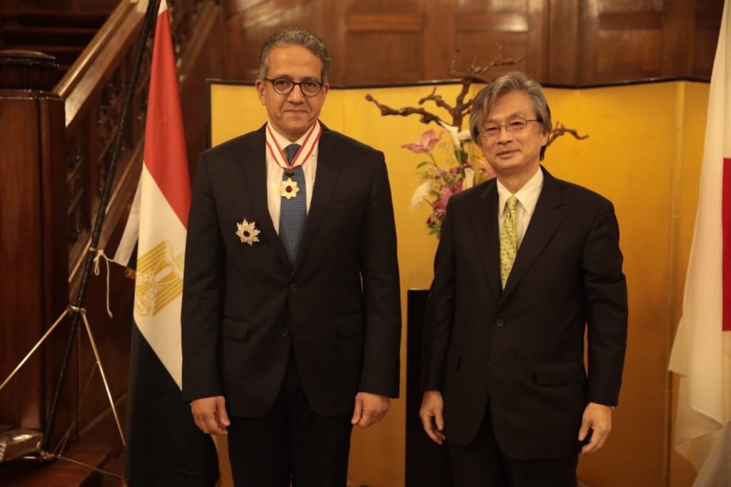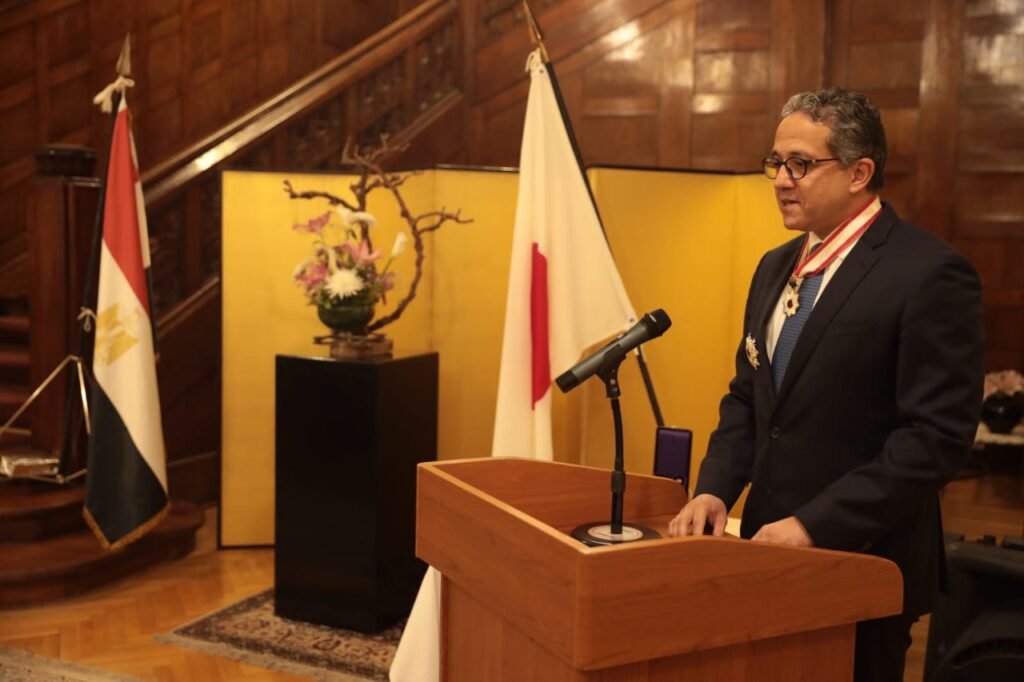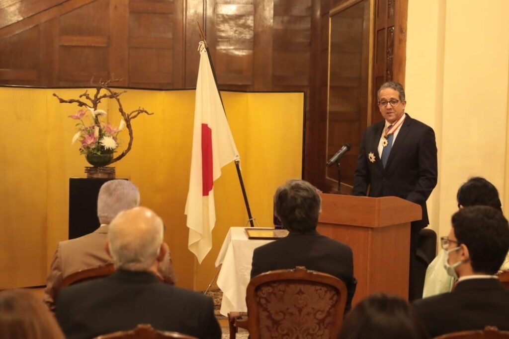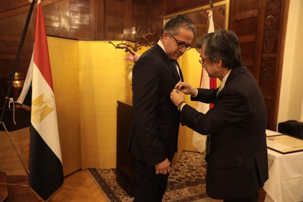 في احتفالية كبري أقيمت مساء اليوم بحديقة مقر السفير الياباني بالقاهرة، تسلم الدكتور خالد العناني وزير السياحة والآثار وسام الشمس المشرقة – نجم ذهبي وفضي ” The Rising Sun, Gold and Silver Star “، من الحكومة اليابانية والتي قد أعلنت في نوفمبر الماضي عن منحها هذا الوسام له وللدكتور زاهي حواس وزير الآثار الأسبق لإسهاماتهما البارزة فى تعزيز العلاقات بين مصر واليابان وتنمية التبادل الثقافي والأكاديمي.