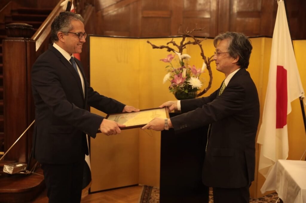 و أشار إلى ما حققه الدكتور خالد العناني من إنجازات بارزة في علاقات الصداقة بين البلدين بصفته وزيرا للسياحة والآثار لسنوات طويلة حيث حضر مراسم تنصيب إمبراطور اليابان نيابة عن فخامة رئيس الجمهورية عام 2019.